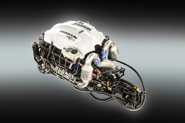 An advanced inter-cooling system increases the 6.2L Monsoon 575's performance and extends its supercharger’s benefits. The engine’s charge cooler is integrated in the supercharger case just above the rotors, with a single air-to-liquid cooling “brick” that substantially lower the temperature of air used in the combustion process.