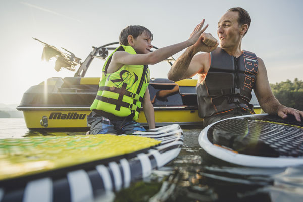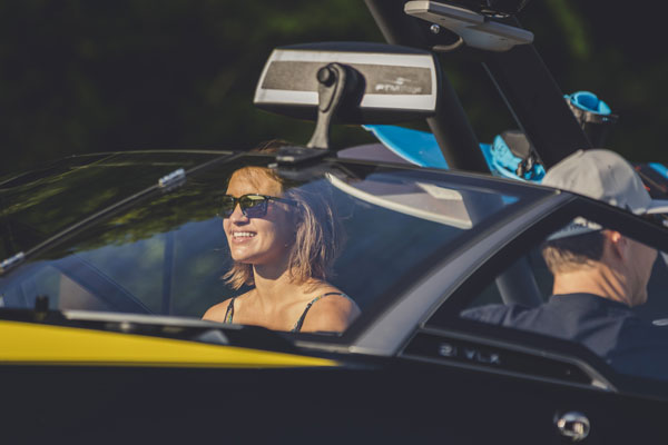 Our staff’s wakesurfing experts were amazed that a boat this size can throw such a long and powerful wave, but, like Malibu says, the truth is on the water. We were really impressed with the length of the pocket on the 21 VLX. We were able to drop back so unbelievably far and the wave still had a ton of push, an uncommon trait for a smaller-size boat. But because of the Surf Gate, combined with the Power Wedge II, all the boats in the 2017 Malibu lineup throw clean, consistent and massive waves. And with Surf Band, which you wear on your wrist while surfing behind the boat, you can control and tweak the wave to your liking while out on the water. The driver can easily command all settings from the 12-inch in-dash touchscreen display, as well as the smaller 7-inch display at the helm.
